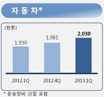 포스코의 1분기 주요 수요산업군별 판매량 가운데 자동차와 가전용 소재 공급은 지속적으로 증가한 반면에 조선용 소재 공급은 감소세가 이어지고 있다.