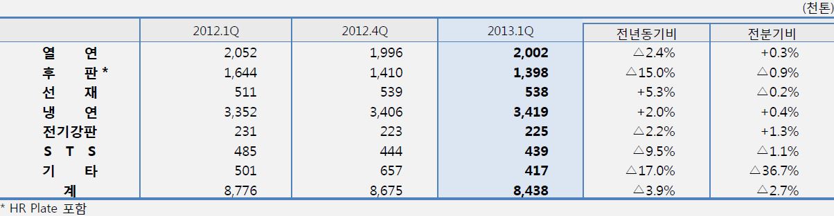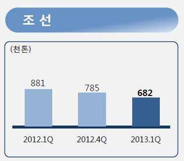 이에 반해 조선용 판매량은 68만2천톤을 기록하며 지난해 1분기에 비해서는 19만9천톤, 직전 분기인 4분기에 비해서는 10만3천톤이 줄었다. 이에 따라 조선용 수요비중이 높은 후판 판매량이 전년동기대비 15.0%, 전기대비 0.9% 감소했다.