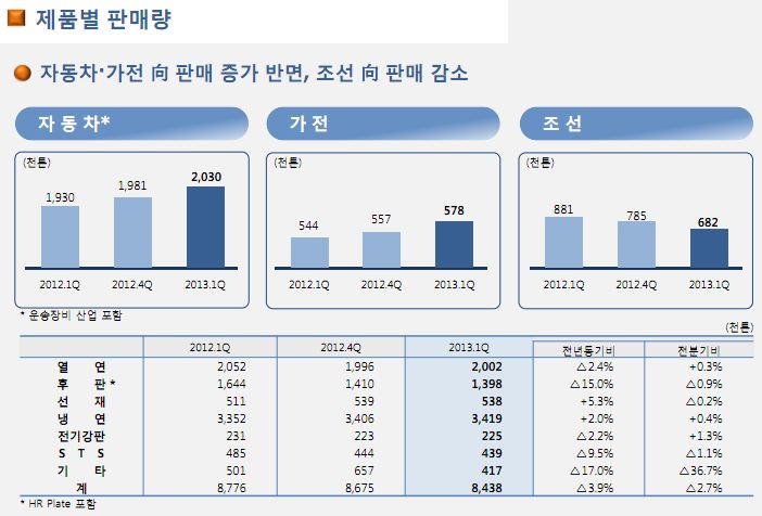 포스코(회장 정준양)의 올 1분기 자동차와 가전향 판매는 증가한 반면 조선향 판매는 감소한 것으로 나타났다.