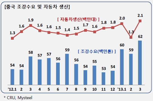 지난 1분기 중국의 자동차 생산은 전년대비 13%, 조강수요는 8% 증가했으나 높은 철강재고로 가격 회복이 쉽지 않았다고 설명했다.