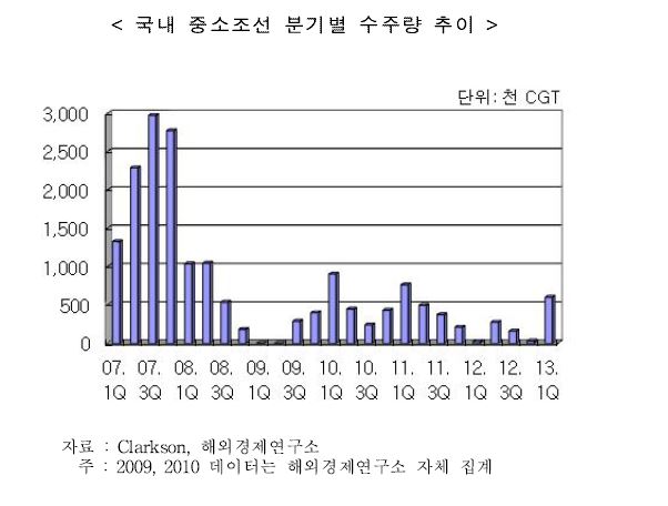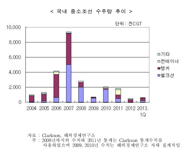 중소조선사는 성동조선해양, SPP조선, 대한조선, 신아에스비, 대선조선, 신안중공업, 세광조선, 21세기조선 등 8곳을 가리킨다. 중소조선사 수주량은 지난 2012년 1분기 2만4,000CGT까지 급감하는 등 수주 가뭄에 극심한 수주가뭄에 시달려야만 했다. 지난해 1분기 이후에도 수주량은 지난 2011년의 50% 수주인 15만9,000∼27만6,000CGT에 불과했다.
