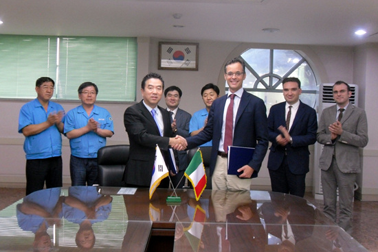▲ 사진 앞줄 왼쪽부터 조일알미늄 이영호 사장과 이탈리아 미노사의 Cesare Pettazzi 전무이사가 본계약 체결 후 기념 촬영을 하고 있다.