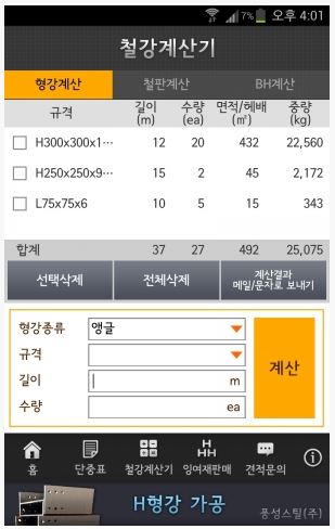 ‘모바일단중표’ 앱은 스마트폰에서 각종 철강재의 규격을 확인 할 수 있으며, 원하는 철강재를 클릭하면 ‘철강계산기’ 메뉴로 연동되어 각종 철강재의 중량, 면적(헤배)을 별도의 PC없이 계산이 가능하다.