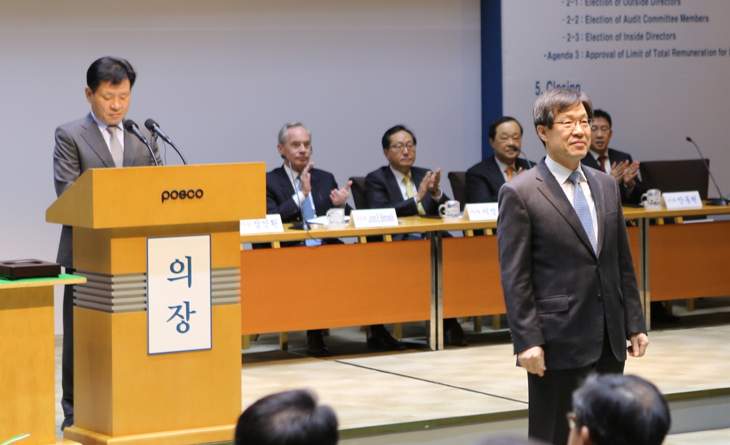 관련기사 (포스코 주총) 취임 회견하는 권오준 회장 포스코 3人 대표이사 체제 포스코 주총서 비정규직 문제로 의견 충돌 권오준 회장 "혁신안 강력 실천" 장인환 부사장 "혁신 통해 성장동력 확보하겠다" 포스코, 14일 제46기 정기주총 개최 권오준號 공식 출범..."POSCO the Great"