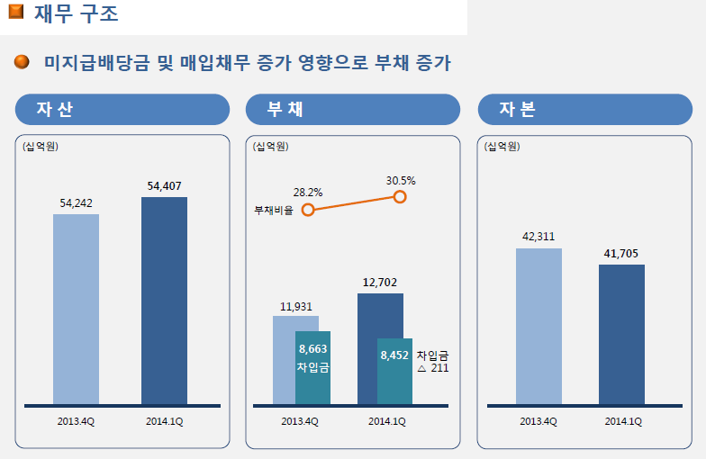 미지급배당금 및 매입채무 증가 영향으로 부채 증가 포스코(회장 권오준)의 올 1분기 자산은 소폭 증가한 반면 부채비율은 전분기에 비해 2.3%p 상승한 것으로 나타났다. 포스코에 따르면 올 1분기 자산은 54조4,070억원으로 전분기 54조2,420억원에 비해 0.3% 증가한 것으로 나타났다. 반면 부채는 12조7,020억원으로 전분기 11조9,310억원에 비해 6.1% 증가했다. 한편 자본은 41조7,050억원으로 지난해 42조3,110억원에 비해 1.5% 감소한 것으로 나타났다. 박재철 parkjc@snmnews.com 다른 기사 보기 관련기사 (포스코 IR) 포스코, 올해 매출 63조 목표 저작권자 © 철강금속신문 무단전재 및 재배포 금지