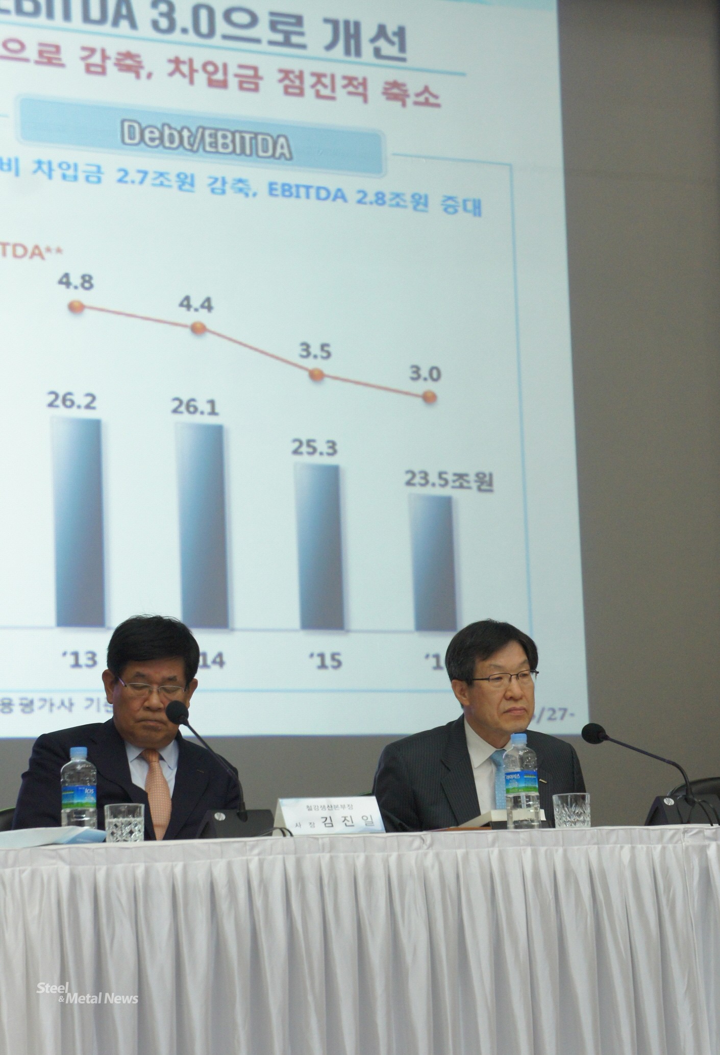 ▲ 권오준 포스코 회장이 19일 여의도 한국거래소에서 열린 기업설명회에서 중기 경영전략에 대한 질의응답을 받고 있다.