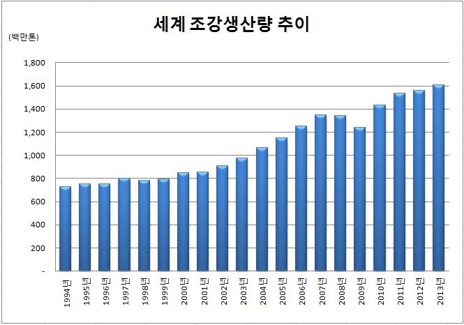 지난해 전세계 조강생산량이 사상 최초로 16억톤을 넘어섰다.