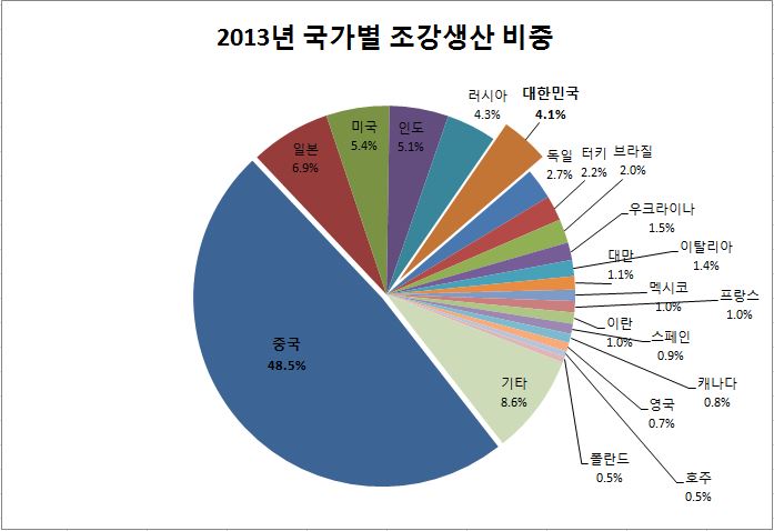 10위권 국가 가운데 중국과 일본, 인도 등 3개국만이 2012년에 비해 조강생산량이 증가한 것으로 나타났다.