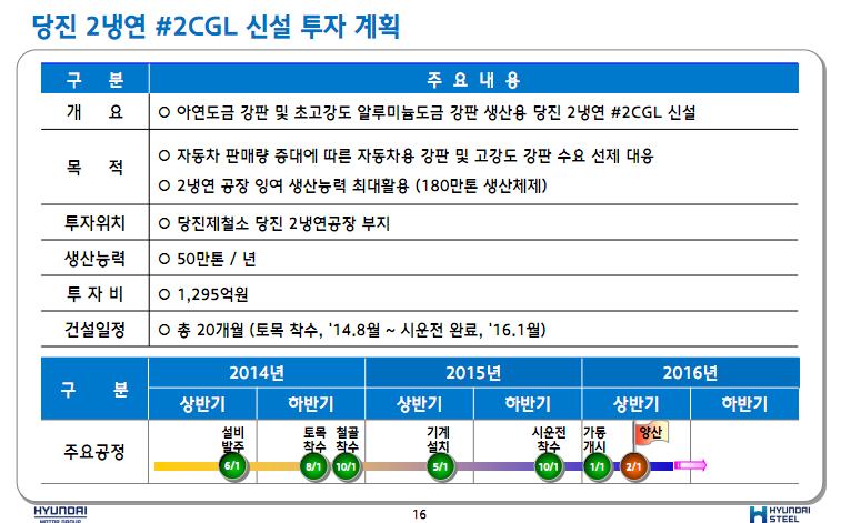 현대제철이 오는 2016년 2월 양산을 목표로 당진 2냉연 내에 #2CGL 신설을 추진하고 있다고 밝혔다.