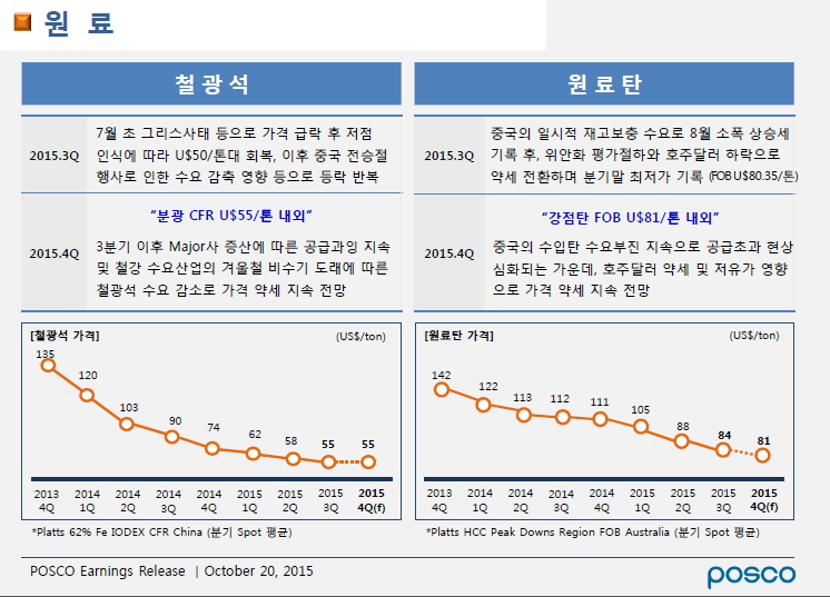 포스코(회장 권오준)가 20일 콘퍼런스콜을 통한 기업설명회(IR)에서 4분기 철광석과 원료탄 가격 약세가 이어질 것이라고 말했다.