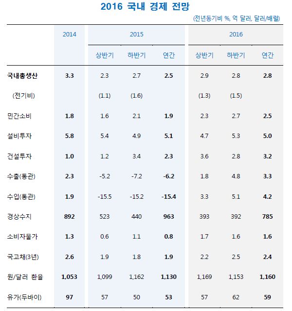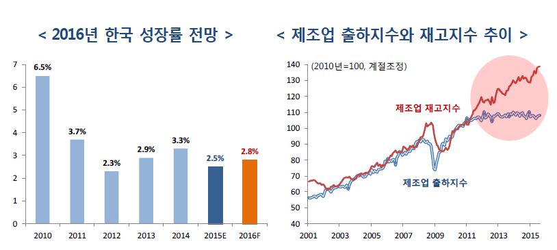 우선 수출의 경우, 투자재와 중간재에 집중된 수출 구조로 인해 글로벌 투자 부진 및 신흥국 성장둔화에 따라 2016년에도 회복이 어려울 전망이다. 반면에 내수는 유가 하락 등으로 실질구매력이 회복됨에 따라 소비를 중심으로 완만하게 개선될 것으로 예상됐다. 다만 내년 시중금리 상승으로 가계부채 부담은 증가할 우려가 커졌다.