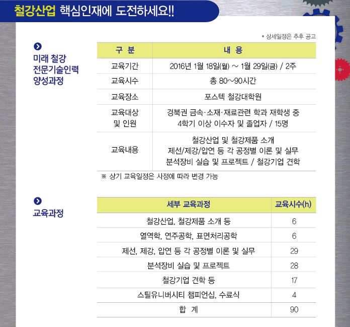 본 교육과정은 경북지역 철강업체에서 미래에 핵심기술인력으로 활약할 관련 전공생분들께 철강 산업의 비전과 경력개발 가능성을 소개하고 관련 고급 산업 전문 기술역량을 미리 체험하게 함으로써 지역철강업계에서 주목받을 수 있는 준비된 경쟁력을 갖춘 인력으로 거듭날 수 있는 기회를 제공코자 기획됐다.