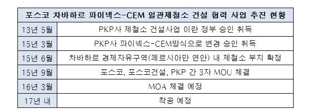 포스코와 PKP(Pars Kohan Diar Parsian Steel Complex)는 차바하르(Chabahar) 경제자유구역에 파이넥스(Finex)와 CEM(Compact Endless casting and rolling Mill, 압축 연속주조 압연설비)을 적용한 일관제철소 건설 협력 사업을 추진 중으로 지난해 9월 20일에는 포스코와 포스코건설, PKP 간의 3자 양해각서(MOU)를 체결했다.
