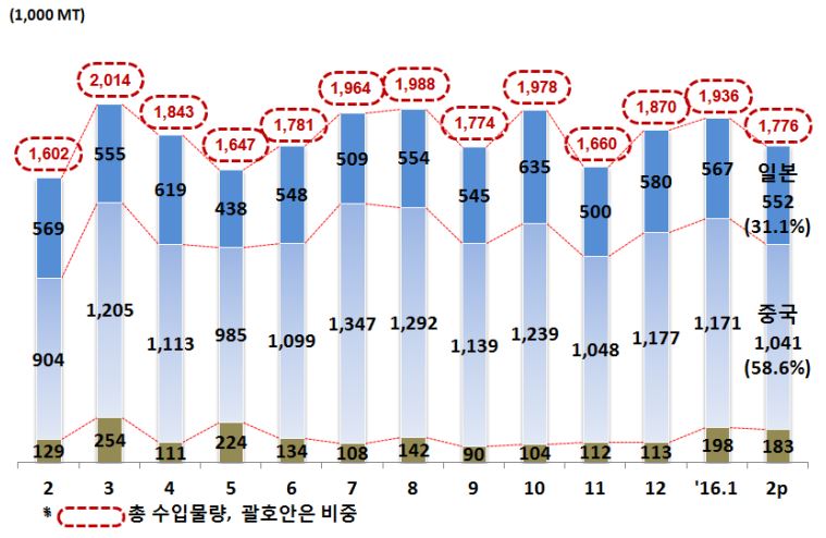 한국의 2016년 2월 철강재 수입이 전년동월대비 대폭 증가했다.