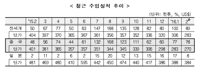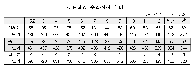 일본산은 엔저로 인해 1월말까지 일본산 수입단가가 하락하면서 지난해 12월부터 1월까지 수입 증가세를 나타냈다. 하지만 2월 중 원엔환율이 상승하면서 2월 수입단가 역시 톤당 528달러로 치솟았다.