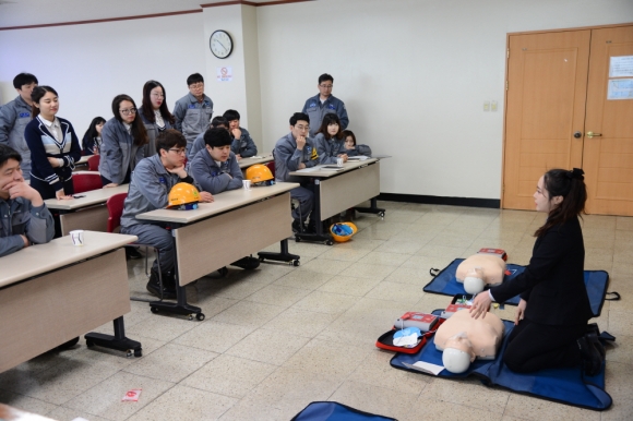 이날 소방교육은 공장 내 화재 및 응급 상황 발생시 대처할 수 있는 화재초기 대응 및 대피법 등에 대한 설명과 심폐소생술 실습으로 진행됐다.