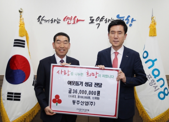 포항시 남구 대송면 소재 동주산업 나채홍 회장은 지난 29일 포항시를 방문해 희망복지지원단과 함께 지역의 어려운 대상자 30세대에 성금 3천6백만원을 전달했다.