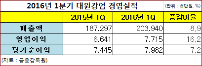 대원강업은 올해 1분기 영업이익이 77억1,5000만원으로 전년 동기 대비 16.2% 증가했다고 16일 밝혔다.