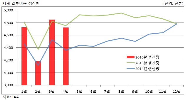 세계 알루미늄 생산량이 4월 다시 감소했다. 세계 최대 생산국인 중국의 생산량 감소 원인이 컸다. 세계알루미늄협회(IAA)에 따르면 2016년 4월 세계 프라이머리(Primary) 알루미늄 생산량은 472만1,000톤으로 전월인 2016년 3월과 전년 동월 대비 모두 감소세를 나타냈다.