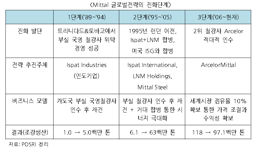 세계 1, 2위 철강사였던 미탈과 아셀로의 합병은 양적 확대 속에 수익성도 양호해 합병 3년 동안에는 전 세계 철강업계의 선망의 대상이 됐다. 양사의 합병 이후에도 포스코에 대한 M&A를 시도하는 등 확장전략을 이어갔다.