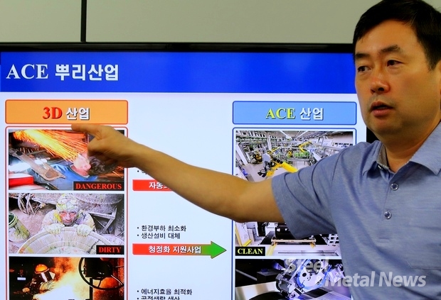 ▲ 이 소장은 뿌리산업을 종전 3D(위험하고,더럽고,어려운) 산업에서 ACE(자동화,청결하고,쉬운) 산업으로 새롭게 명명했다. 이 소장이 ACE의 개념에 대해 설명하고 있다.