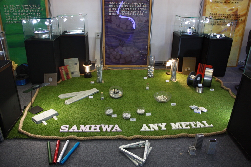 철 구조물 부식방지용 용사용 재료인 아연선과 아연볼(ZINC WIRE & BALL)·아연-알루미늄 합금선(ZINC-ALUMINIUM ALLOY WIRE)과 아연 전기도금 라인에 사용되는 원료인 아연아노드(ZINC ANODE), 전기와 전자재료의 각종 금속재료의 접합에 사용되는 솔더바와 솔더선(SOLDER BAR& WIRE), 환경 친화적인 무연 재료인 주석-아연 합금선(TIN-ZINC ALLOY WIRE) 등 다양한 제품을 전시했다.
