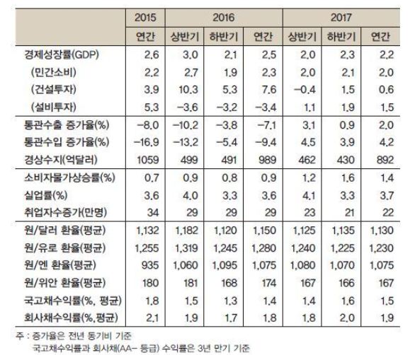 내수경기에서는 올해 주택부문을 중심으로 성장을 이끌어온 건설투자가 크게 약화되고, 고용둔화와 저유가 효과 축소로 가계의 소비여력도 낮아지면서 소비 및 설비투자도 부진할 것으로 분석했다.