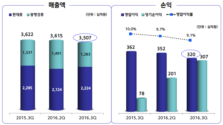 특히 봉형강 매출액은 철근, H형강 등의 계절적 비수기로 인해 2분기 1조4,910억원에서 3분기 1조2,830억원으로 2,080억원이 줄었다.
