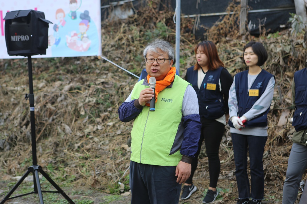 ▲ 송재빈 한국철강협회 부회장이 연탄 배달 전 참가자들에게 인사하고 있다.