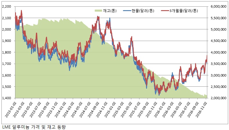 지난 10월 말 1년 4개월 만에 톤당 1,700달러를 회복한 런던금속거래소(LME) 알루미늄 가격든 10일 현재까지 8 거래일 연속 톤당 1,700달러를 지키고 있다.