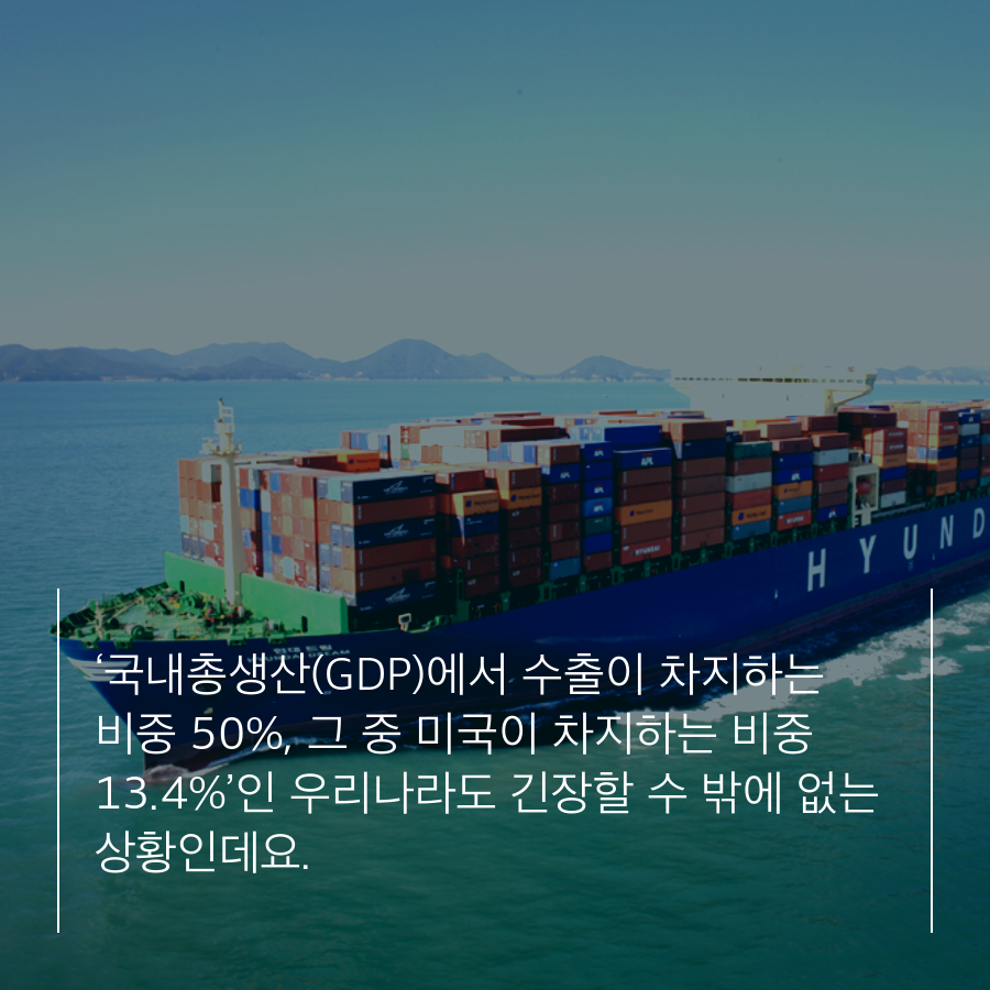 ‘국내총생산(GDP)에서 수출이 차지하는 비중 50%, 그 중 미국이 차지하는 비중 13.4%’인 우리나라도 긴장할 수 밖에 없는 상황인데요.