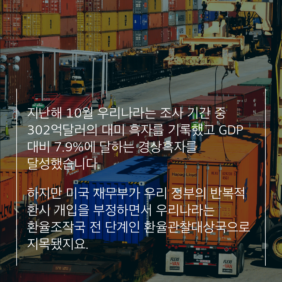 지난해 10월 우리나라는 조사 기간 중 302억달러의 대미 흑자를 기록했고 GDP 대비 7.9%에 달하는 경상흑자를 달성했습니다.