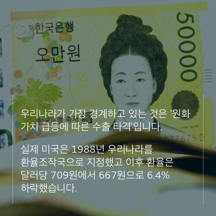 환율조작국으로 지정이 되면 △미국 기업의 한국 투자 시 금융지원 금지 △우리 기업의 미 연방정부 조달시장 진입 금지 등의 제재를 받게 되지만 우리나라가 가장 경계하고 있는 것은 ‘원화 가치 급등에 따른 수출 타격’입니다.