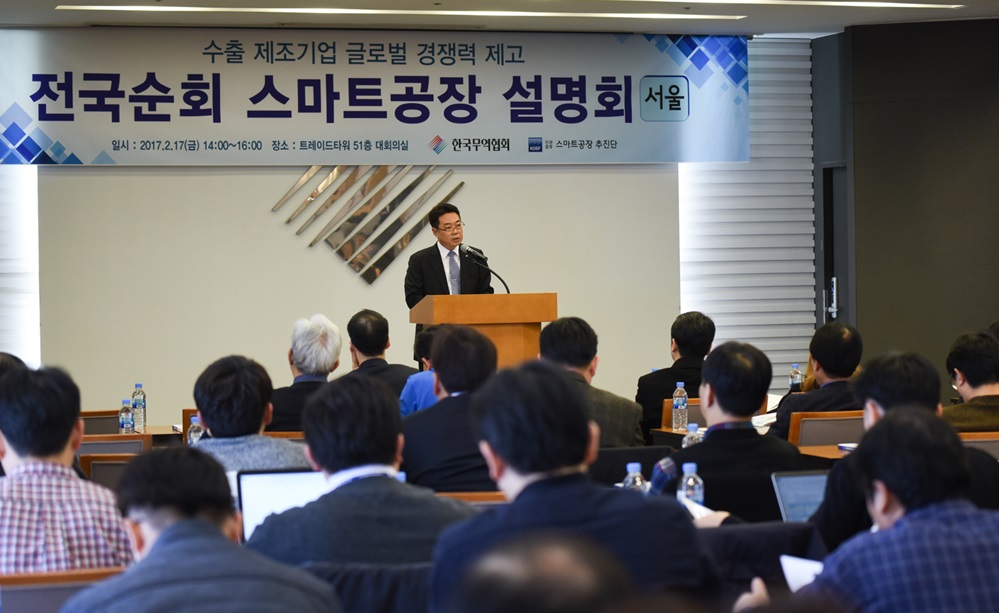 한국무역협회(회장 김인호)와 민관합동 스마트공장추진단(단장 박진우)은 17일(금) 서울 삼성동 트레이드타워에서 200명이 넘는 중소·중견 수출기업 관계자가 참석한 가운데 ‘전국순회 스마트공장 설명회’를 개최했다고 밝혔다.