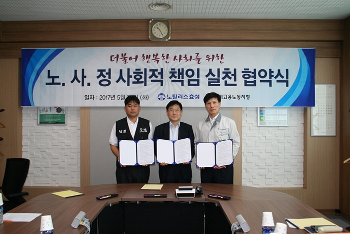 노틸러스효성 구미공장이 지난달 30일 일자리 창출, 협력사와의 동반성장 등에 관한 노사정 사회적 책임 실천 협약을 체결했다.