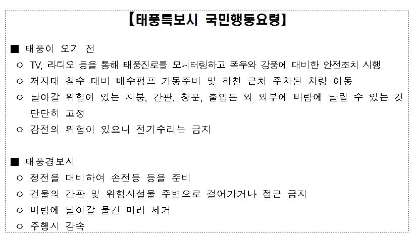 태풍 노루에 대비해 현재 조성 중인 산업단지 및 건설현장 사전 안전점검을 실시한 한국산업단지공단 황규연 이사장은 “유동적인 태풍 진행 경로를 실시간 모니터링하고 단계별 대처상황 및 국민행동요령을 집중 홍보하라”고 지시하는 등 입주 업체 불편 및 인명·재산 피해가 발생하지 않도록 만전을 기할 것을 거듭 당부했다.