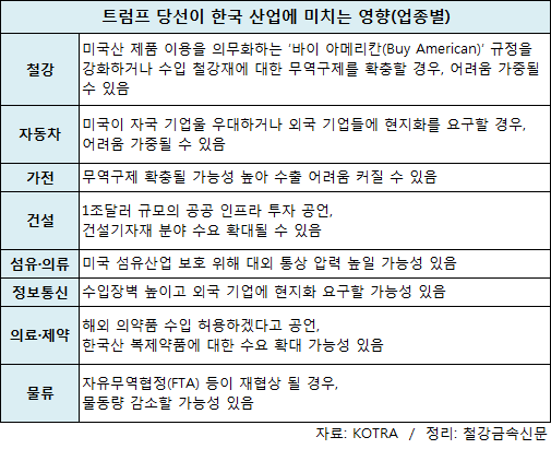 ‘보호무역 강화’를 주장해 온 도널드 트럼프 공화당 후보가 ‘제45대 미국 대통령’에 당선되면서 한국 기업들은 가시화될 수 있는 피해에 우려를 표출하고 있다. 트럼프 당선이 철강, 자동차, 가전 등 주력산업에 미치는 영향을 업종별로 간략하게 살펴본다.