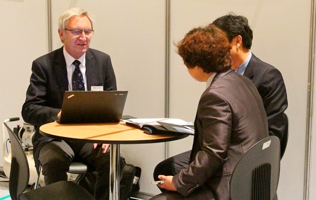 이번 전시회를 통해 뿌리기업 등은 국내외 첨단 신소재와 응용기술을 한 자리에서 보고 체험할 수 있다. 세라믹분말 성형프레스 등을 선보인 유로산업 전시부스에서 회사 관계자들이 독일 바이어(왼쪽 첫번째)와 수출 상담을 펼치고 있다.