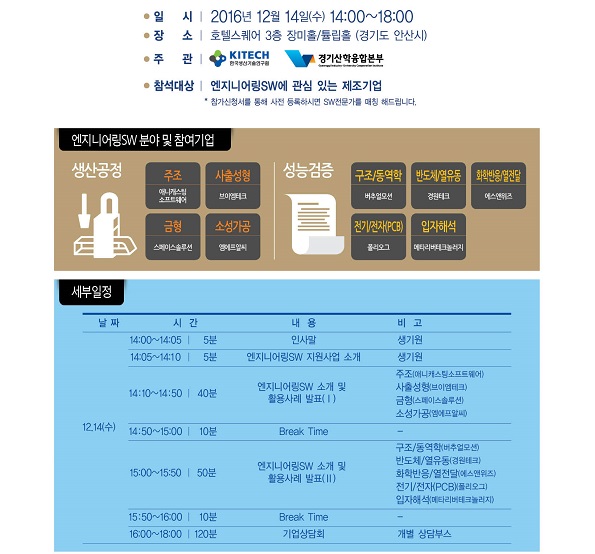 한국생산기술연구원(이하 생기원)은 다음 달 14일 경기도 안산시 호텔스퀘어 튤립홀에서 ‘2016 엔지니어링 SW 기술 설명회 및 상담회’를 개최한다고 25일 밝혔다.
