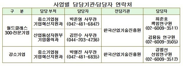두 부처가 이날 공동으로 내놓은 이 사업은 우수한 기술력을 갖춘 중소·중견기업을 선정해 세계 시장 점유율 1~3위오 육성, 국내 중소기업의 세계 시장 지배력을 강화하는 사업이다.