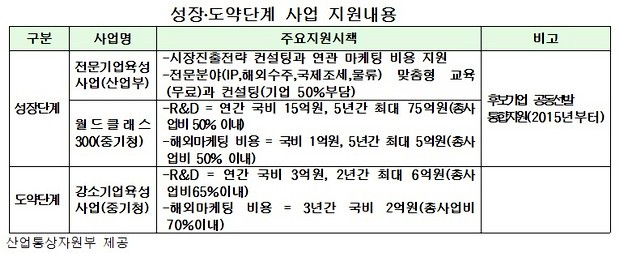 우선 성장 단계는 매출 400억원에서 1조원 사업으로 전문기업 육성사업인 ‘월드클래스 300’사업이다. 도약 단계는 매출 100억원에서 1,000억원의 강소기업 육성 사업이다.