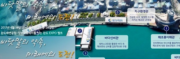 31일 박람회조직위원회에 따르면 ‘바닷말의 약속, 미래에의 도전’을 주제로 4월 14일부터 5월 7일까지 열리는 이번 박람회는 7개 관에서 진행되며, 이중 3개(2,3,4관)는 완도해변공원 앞바다에 설치된다.