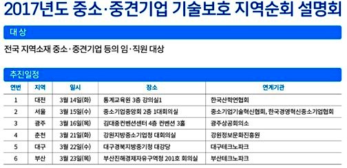 중소기업청이 중소·중견기업을 위한 기술보호 지원제도를 알리기 위해 전국 6개 도시에서 ‘2017년도 중소·중견기업 기술보호 지원제도 설명회’를 개최한다고 14일 밝혔다.
