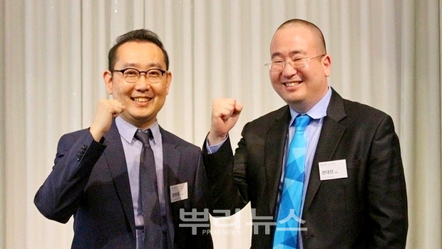 두 사람이 인터뷰 이후 양사 시너지를 위해 구호를 외치고 있다.