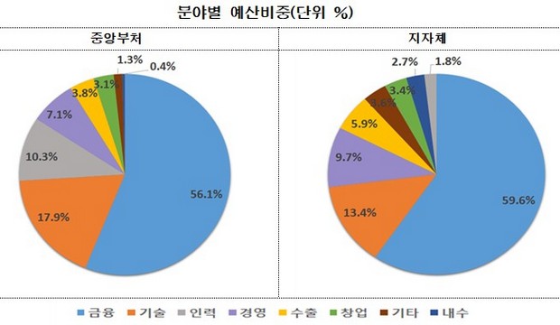 올해 예산은 금융 분야 146개 사업(9조4,00억원,56.6%), 기술 295개 사업(2조9,000억원,17.3%), 인력 84개 사업(1조5,000억원,9.1%)롤 각각 조사됐다.