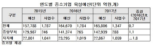 한편, 최근 3년 간 중소기업 육성예산은 2015년 15조3,000억원에서 2016년 16조5,000억원 등으로 꾸준히 늘었다.