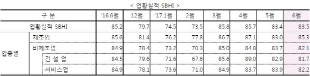 2017년 6월 업황실적 중소기업건강도지수(SBHI)는 83.5로 전월 대비 0.1p 상승하고, 전년 동월 대비 1.7p 하락하였다. 그 중 제조업은 전월 대비 2.3p 상승한 85.3을 기록하였고, 비제조업은 건설업이 전월 대비 1.2p 하락하고 서비스업이 전월 대비 1.7p 하락하여 전월 대비 1.6p 하락한 82.1로 나타났다.