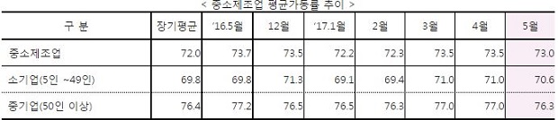 5월 중소제조업 평균가동률은 73.0%으로 전월 대비 0.5p 하락