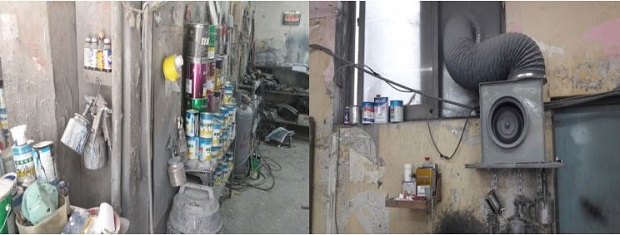 (왼쪽)무허가로 자동차 불법도장을 하기 위해 비치한 스프레이건, 각종 페인트 및 시너, (오른쪽)불법 도장업소내 냄새를 외부로 빼내기 위해 형식적으로 설치한 환풍기. (사진=서울시)