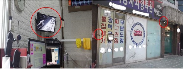사업장 안에서 주변을 살피기 위해 CCTV를 설치한 모습(왼쪽)과 사업장 안에서 불법도장을 하기 위해 CCTV 설치하고 문을 잠근 모습(붉은 원 안). (사진=서울시)